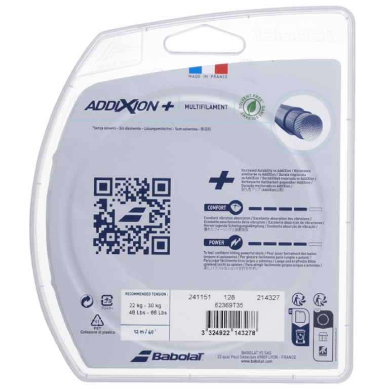 Bạn có muốn một sợi dây kết hợp sự thoải mái, độ bền và sức mạnh? Khám phá AddiXion +, một sợi dây mạnh mẽ, năng động cho phép chơi trong nhiều giờ. Với tuổi thọ dài hơn AddiXion 25%, sợi dây tennis thoải mái này giúp bạn có thêm sức mạnh, đồng thời làm giảm độ rung. Điểm cộng khác của nó là gì? Dây AddiXion + không chứa dung môi và được sản xuất tại Pháp.