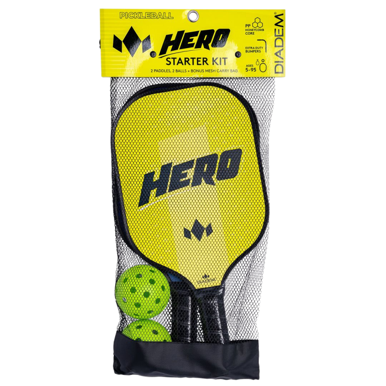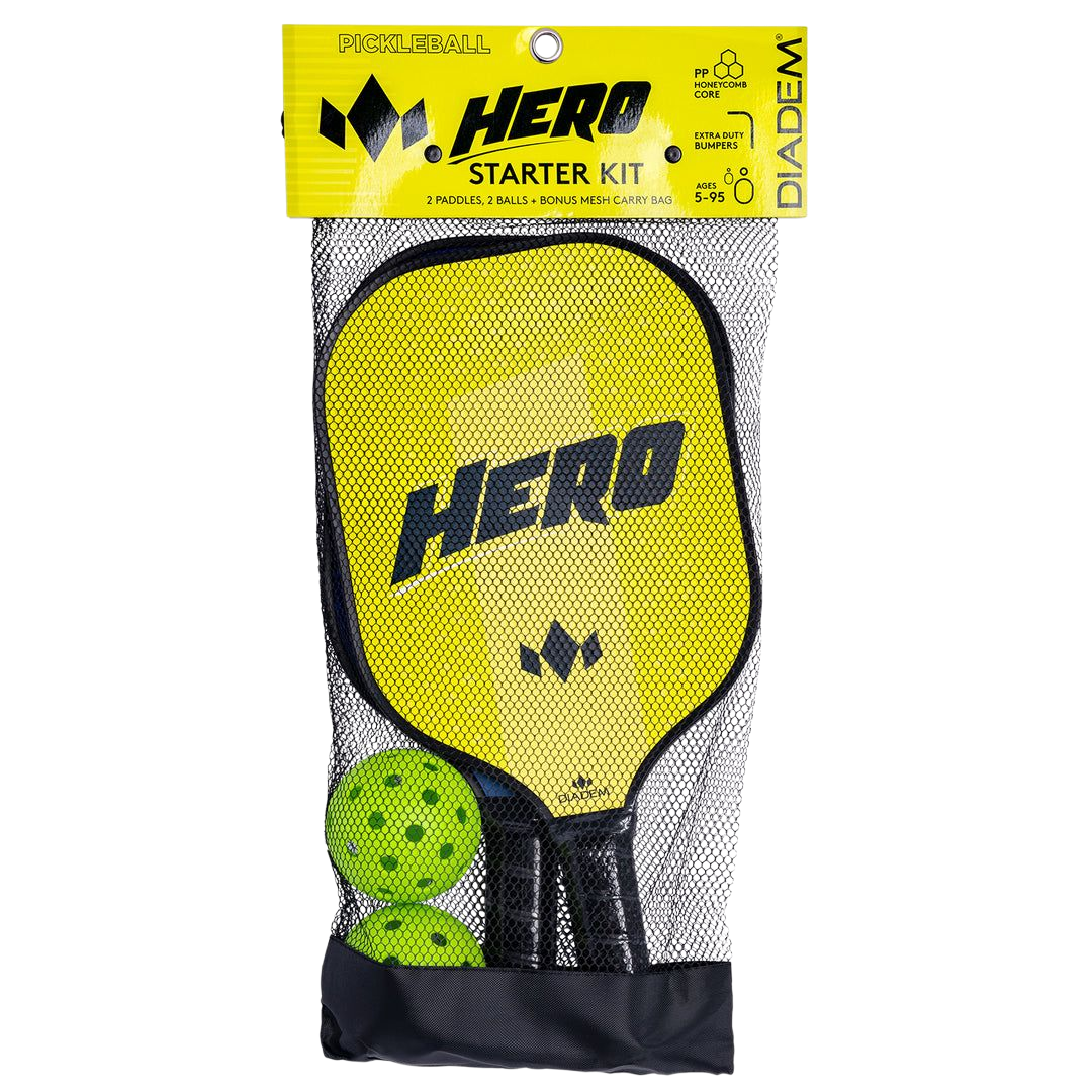 Bộ Hero Starter Kit là gói hoàn hảo cho những người chơi pickleball lần đầu tiên. Bao gồm mọi thứ bạn cần ngoại trừ sân chơi. Hai vợt Hero (một màu cam, một màu xanh dương) và 2 quả bóng pickleball cùng với một túi lưới. Mặt vợt rộng giúp bạn có diện tích tiếp xúc tối đa với bóng khi đang học chơi. Sử dụng cùng chất liệu sợi HMT như dòng Riptide của chúng tôi, vợt Hero nhẹ và dễ xoay. Bumper dày ngăn ngừa hư hỏng trong những ngày học chơi trên sân. Với độ dày 0.55 inch và lõi tổ ong 8mm, sức mạnh sẽ dễ dàng đạt được. Nhà vô địch pickleball tiếp theo bắt đầu từ đây.